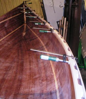 Die erste Leiste Beachte, was Ted Moores dazu sagt. Tip Schraube die erste Leiste an den Mittelspant, Spant 0, mit Schrauben an. ( Leiste vorbohren ) Ein gutes Maß ist, wenn die Höhendifferenz, der Bogen am Bug und Heck, 3 cm bis 5 cm beträgt, nicht mehr. ( Verwindungen werden zu stark ) Fixiere die Leiste im Wunschmaß am Außensteven mit einer Schraubzwinge und Schraube die Leiste an die Mallen - bis Mall 5. Schraube kleine Stützklötzchen unter die erste Leiste so dass diese Klötzchen den Druck aufnehmen können ,den die spätere Verkeilung verursacht. Textende Weiterer Text folgt - dann strukturiert zu den Bildern. | |