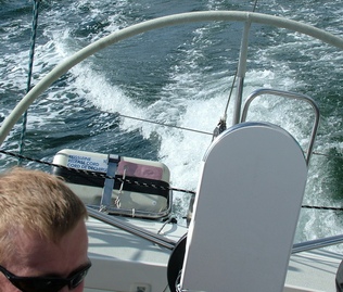 Für kurze Zeit, weisse Heckwelle bei 14 kn Speed.